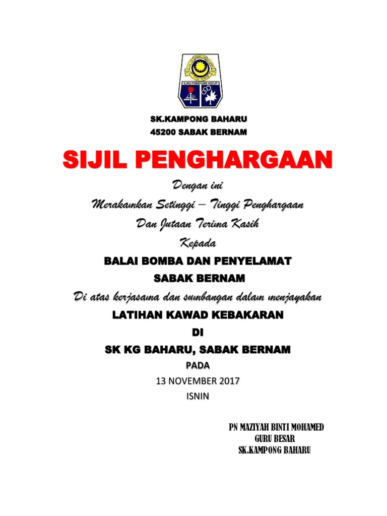 Sijil Penghargaan Balai Bomba Penyelamat Port Dickson Facebook